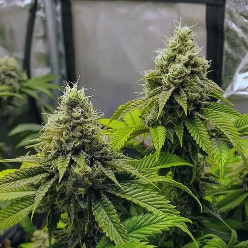 Visually, the buds show deep green tones with purple touches and bright orange pistils that contrast with the white layer of trichomes. Flowering is completed in around 9 to 10 weeks, delivering high and consistent yields both indoors and outdoors.