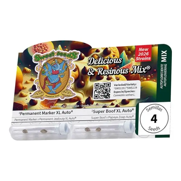 Delicious & Resinous Mix by Sweet Seeds is a limited edition autoflowering seed pack that brings together two gems of modern cannabis: Permanent Marker XL Auto and Super Boof XL Auto. Both genetics stand out for their trichome production, potency, and complex aromatic profile. Ideal varieties for both flower production and top-tier resin extractions. A perfect opportunity to discover elite autoflowering genetics at an irresistible price.